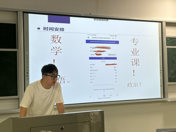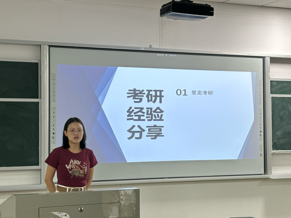 在考研分享阶段,学生代表们则结合自身考研经历,从选取考研院校、制定复习计划以及心态调整等方面进行了详细的分享。他们谈到了在备考过程中遇到的困难和挑战,以及如何通过调整策略、保持积极心态来克服这些困难。现场掌声此起彼伏,同学们纷纷表示受益匪浅。