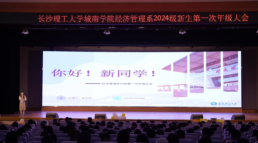 9月17日晚,城南学院经济管理系为迎接2024级本科新生,帮助其更快地融入大学生活并适应大学节奏,特别在五教大礼堂举办了2024级本科新生的第一次年级大会。此次会议由2024级辅导员林安妮主持,年级辅导员朱骞、赵泽铭及2024级全体新生参加大会。