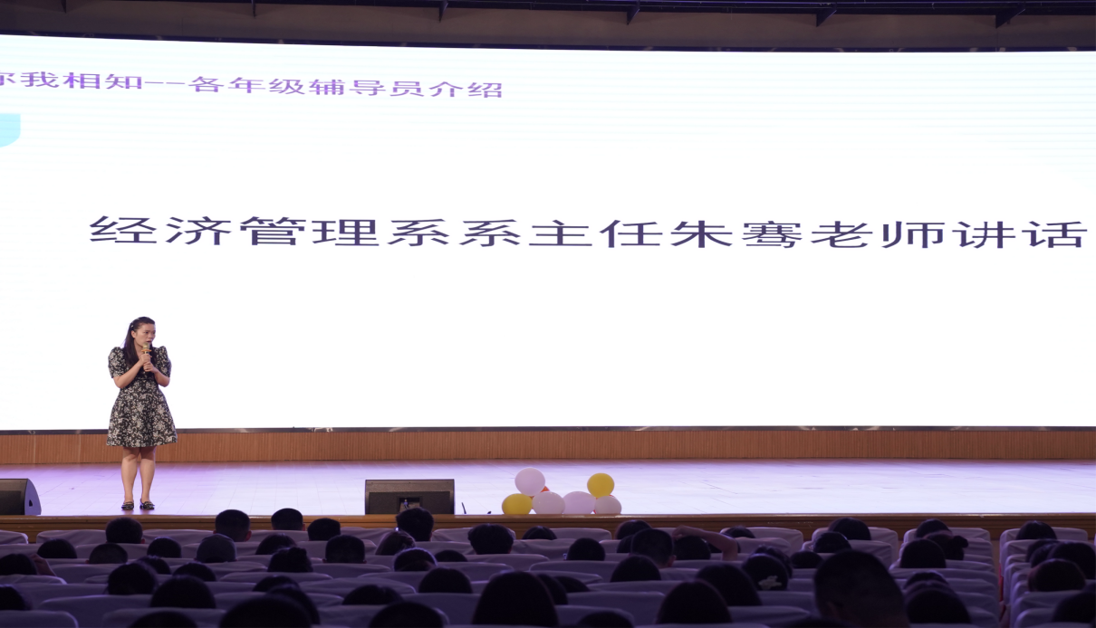 随后,经济管理系系主任朱骞老师登台,她以高度的责任感和使命感,向新生们全面介绍了经济管理系的办学特色、师资力量、教学成果及学生发展平台。朱老师指出,作为经济管理系的一员,每位新生都肩负着维护良好学习风气、营造和谐生活环境的重要责任,希望大家能够携手并进,共同为经济管理系的繁荣发展贡献力量。她的发言不仅让新生们对即将开启的大学生活有了更加清晰的认识,也激发了他们对未来四年学习生活的无限憧憬与热情。