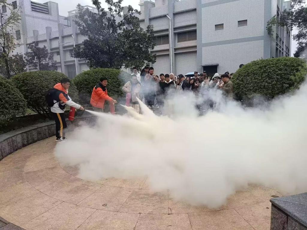 最后,开展灭火演练活动。保卫处马老师现场教学,详细演示了干粉灭火器的正确使用方法,并鼓励同学们亲自操作实践。在指导老师的耐心指导下,同学们纷纷化身为“消防战士”,成功扑灭了模拟火源,亲身体验了初期火灾扑救的实战技巧,有效提升了火灾初期的应急处置能力。