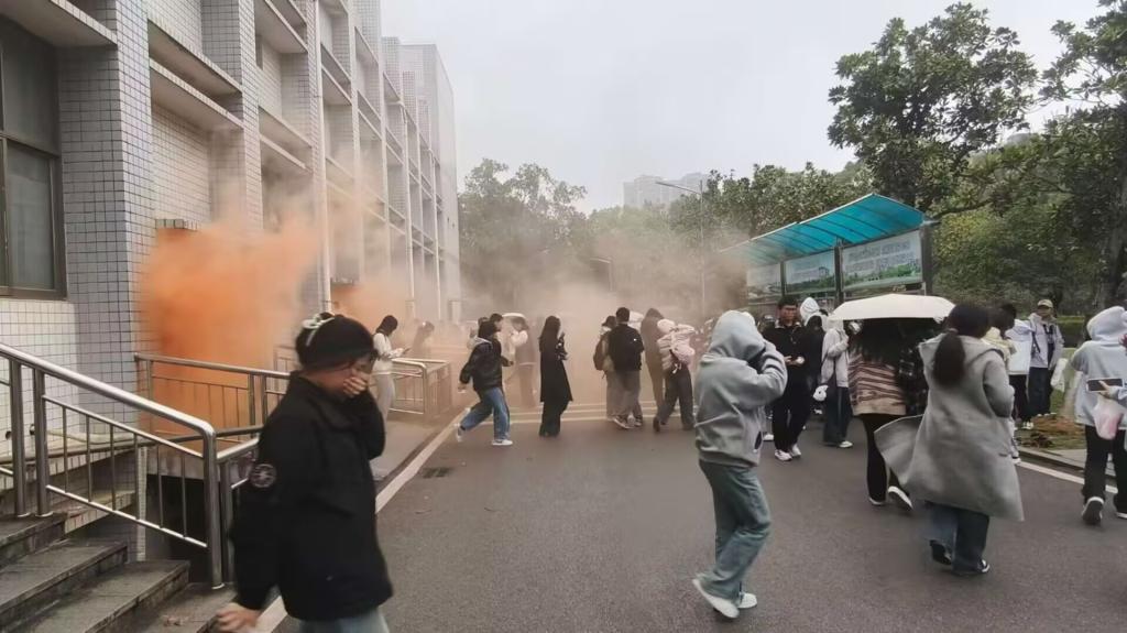 讲座结束后,举行了疏散逃生演练活动。随着火灾警报声骤然响起,模拟的火灾现场浓烟滚滚,营造出逼真的火灾逃生场景。在保卫处工作人员的专业指挥下,同学们迅速进入应急状态,采用正确的自我保护姿势,即捂住口鼻、弯腰低姿,按照预先规划的疏散路线,迅速而有序地撤离至安全地带。此次演练不仅锻炼了师生的应急反应能力,也验证了学院消防安全应急预案的有效性和可操作性。