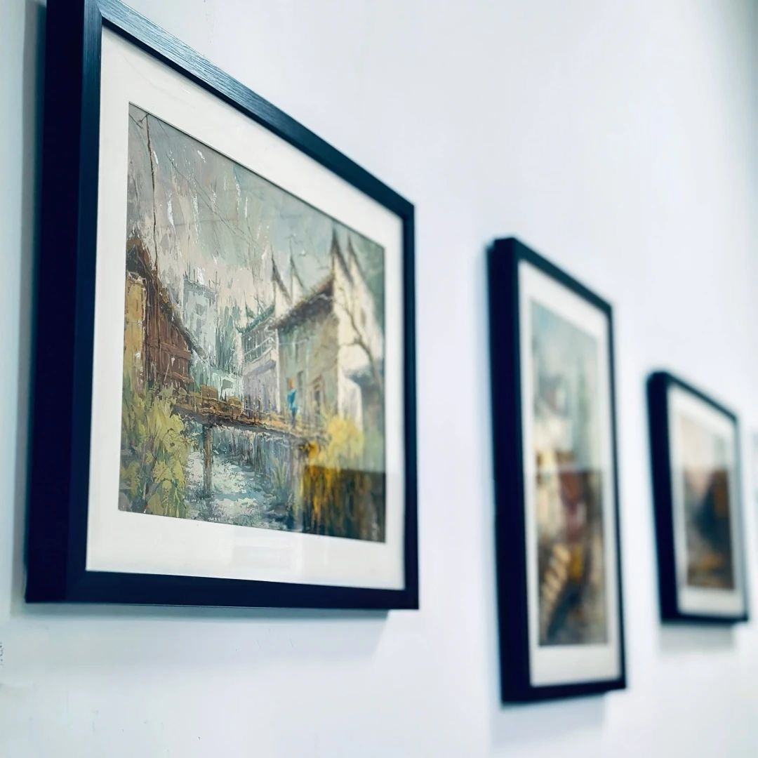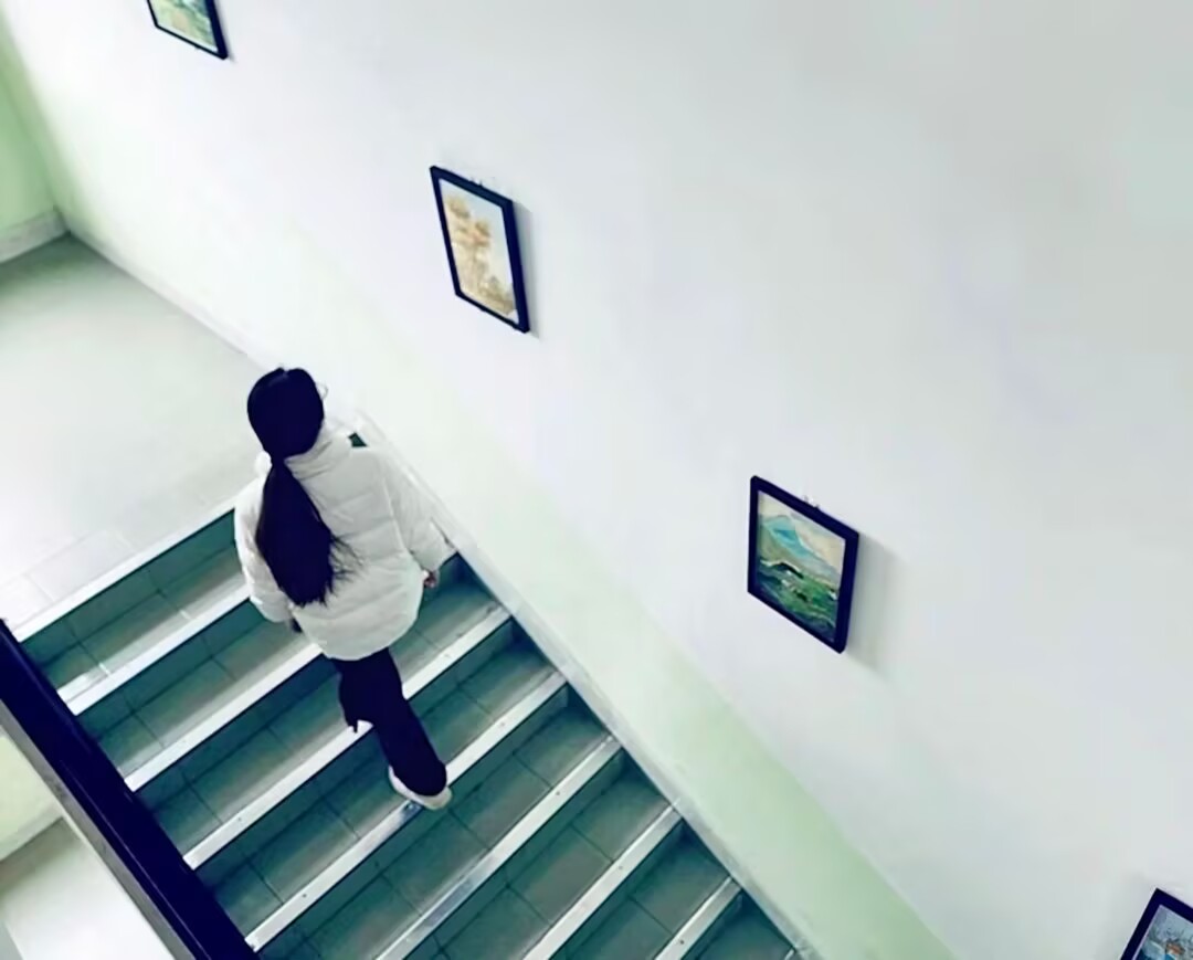 展览分为两个区域。二教东侧走廊展示了空间改造设计作品,这些作品巧妙地利用空间元素,创造出既实用又富有艺术感的展示空间。而西侧走廊则被打造成了一个挂画的雅致空间,每一幅画都悬挂在墙上,以其独特的笔触和色彩,诉说着属于它们自己的故事,让观者仿佛置身于一个梦幻般的艺术世界。