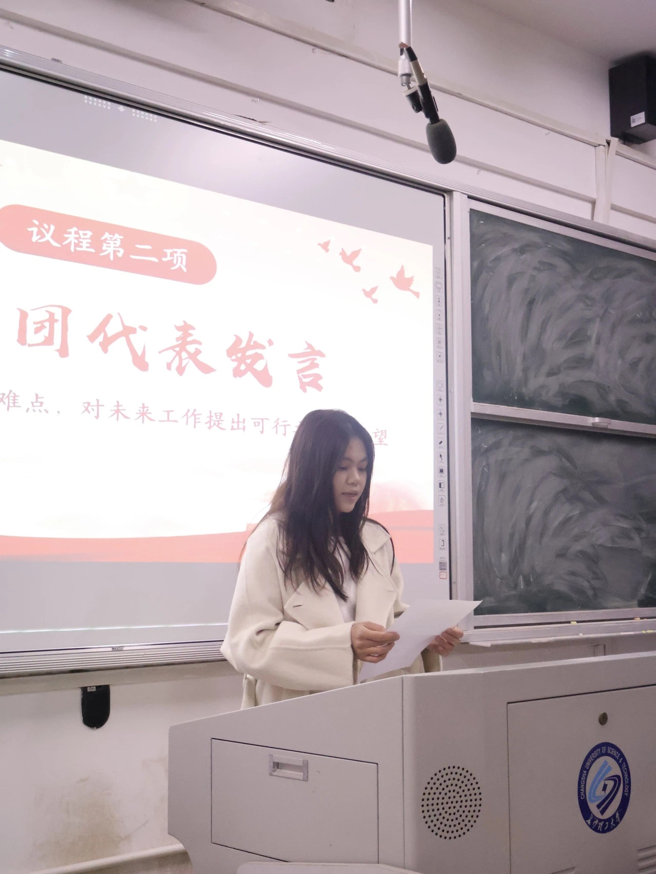 最后,周心怡老师上台发言。她对大会的召开表示热烈祝贺,并对同学们提出了殷切希望。她希望大家能够珍惜大学时光,努力学习专业知识,积极参与社会实践,不断提升自己的综合素质和能力水平。同时,她也鼓励大家要敢于追梦、勇于担当,为实现中华民族伟大复兴的中国梦贡献自己的力量。此次团学大会的召开,不仅让同学们对过去一年的工作有了更加清晰的认识和总结,更为大家指明了未来的奋斗方向和目标。相信在全体同学的共同努力下,文法艺术系的团学工作会做得越来越好!