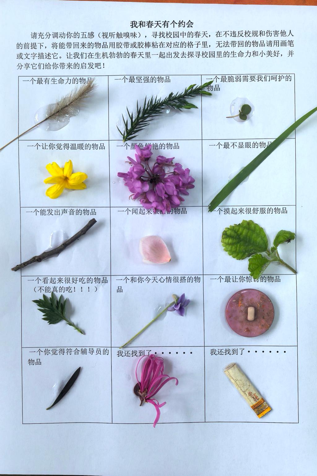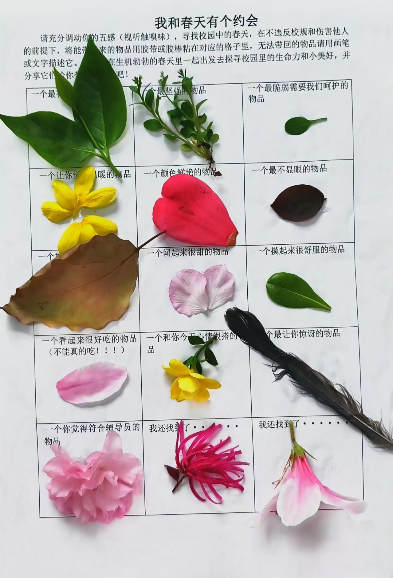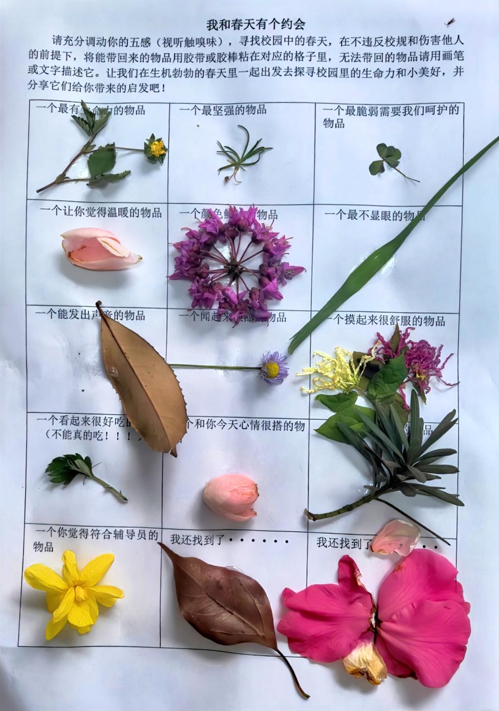 活动伊始,心建部为参与者发放了特制表格,内容涵盖“你觉得很坚强的物品”等多个独特视角,鼓励同学们从不同感官和情感角度去观察春天在活动过程中,同学们不仅专注于个体观察,还积极展开交流讨论通过多角度记录和探寻自然细节,不断在观察中触发思考,在思考中探索自我内心。