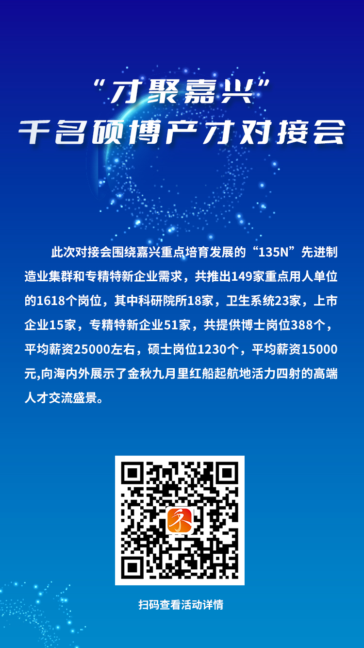 此次对接会围绕嘉兴重点培育发展的“135N”先进制造业集群和专精特新企业需求,共推出149家重点用人单位的1618个岗位,其中科研院所18家,卫生系统23家,上市企业15家,专精特新企业51家,共提供博士岗位388个,平均薪资25000左右,硕士岗位1230个,平均薪资15000元,向海内外展示了金秋九月里红船起航地活力四射的高端人才交流盛景。诚邀硕博人才投递简历,来嘉就业创业,共建大美嘉兴。