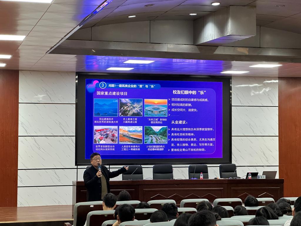 靳攀科从大数据角度分析2024届交通土建系毕业生就业形势、从秋招感受谈2024届就业、从建筑类企业的“苦”与“乐”,从求职与职场发展案例等四个角度对本次讲座进行了讲解。