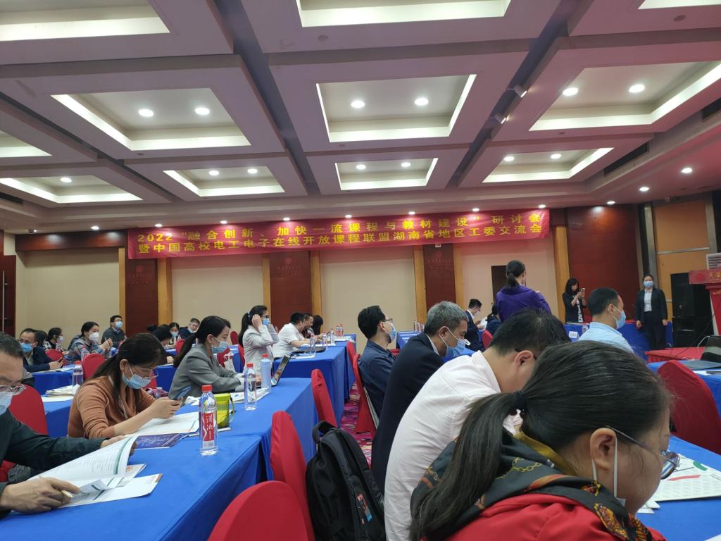 2021年5月14日,在芙蓉华天大酒店举行了2022年“融合创新、加快一流课程与教材建设”研讨会暨中国高校电工电子在线开放课程联盟湖南省地区工委交流会。电气学院选派雷辉等教师参加了研讨会。