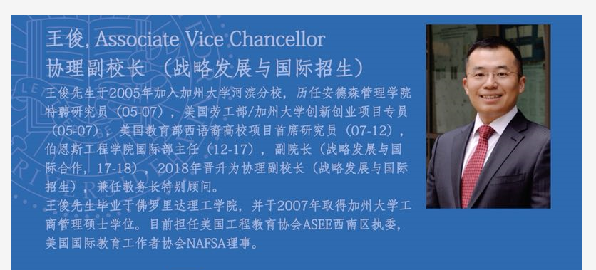 为进一步加强伟德官网同世界主要国家间的高等教育交流,培养国际化复合型人才,鼓励并支持在校学生积极参与国(境)外学习交流,培养具有国际视野和国际竞争力的创新型人才,伟德官网与美国加州大学河滨分校合作推出了几个出国学习交流项目(详情见公告通知栏)。近日,该校协理副校长王俊将访问伟德官网,与对加州大学河滨分校出国学习交流项目感兴趣的同学直接会面。请有意向参加相关项目的同学准时参加。