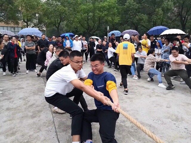 10月22日13:00,计通学院2019级新生在金盆岭校区南苑篮球场开展了本学期第一次拔河比赛。