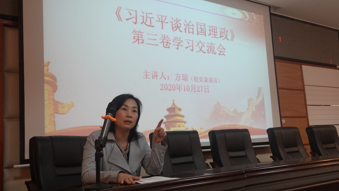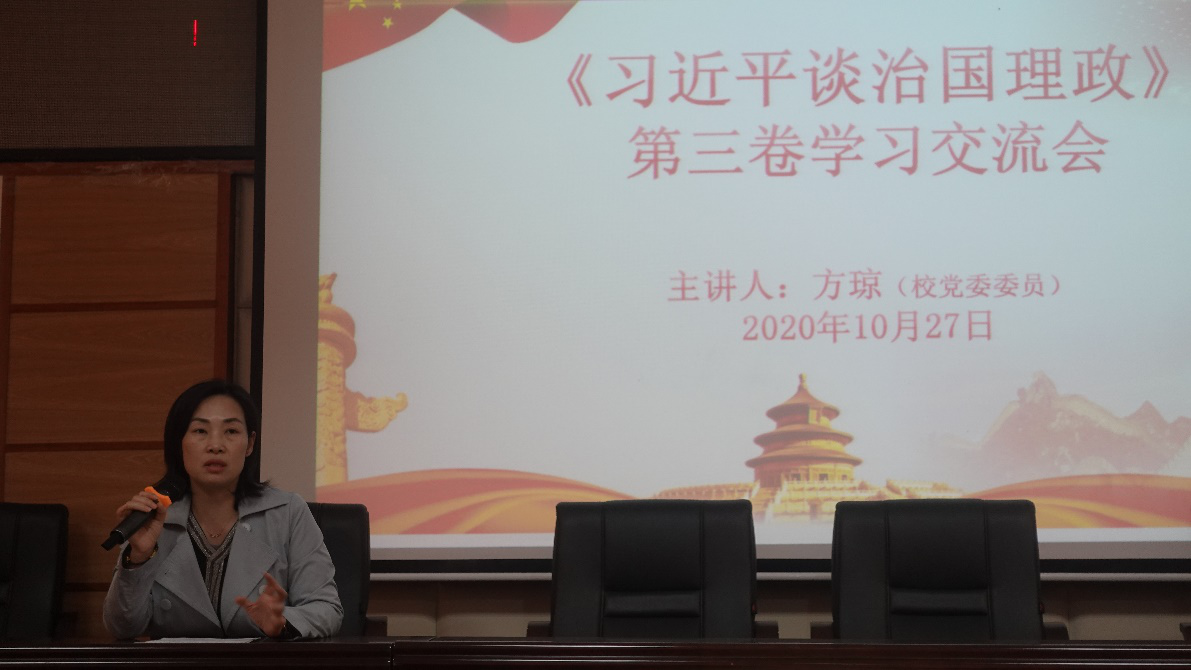 10月27日下午,校党委委员、党委宣传部长方琼在理科楼B311开展了《习近平谈治国理政》第三卷学习交流会。本次交流会也是她与所联系的计通学院计科1801班的全体同学进行的一次交流分享会,计通学院党委副书记涂道勇、2018级辅导员郑国义、班主任陈曦和计科1801班全体同学共同参与了本次学习交流。