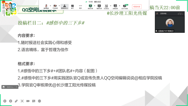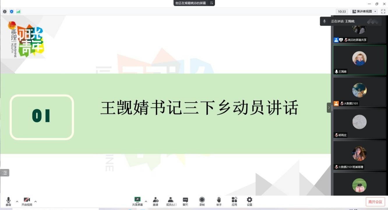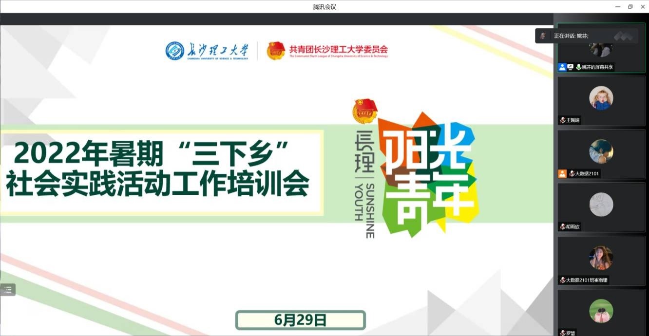 629日晚,计通学院2022年暑期三下乡社会实践活动专题培训通过腾讯会议召开,学院150多名三下乡团队成员参与了专题培训。会议内容包括安全培训、宣传工作安排、团队投稿流程三部分。学院党委副书记王觊婧、团委书记潘枝花、团委副书记齐铁钧出席本次会议。