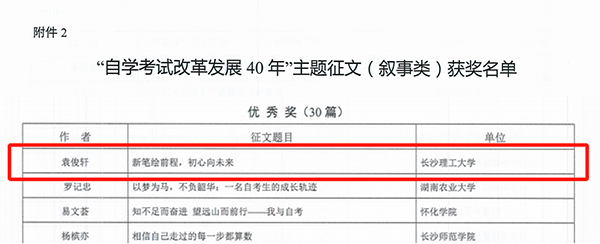省教育厅发布《关于公布“自学考试改革发展40年”主题征文和资料征集活动评选结果的通知》,正式公布“自学考试改革发展40年”主题征文和资料征集活动评选结果,我院荣获“自学考试改革发展40年”主题征文和资料征集活动优秀组织奖1项,主题征文一等奖1项、主题征文二等奖1项、主题征文三等奖1项、主题征文优秀奖1项,总共获得5项殊荣。2025年1月8日湖南省教育厅组织召开湖南省高等教育自学考试高质量发展会议,在颁奖环节为此次活动的获奖单位和个人举行了隆重的颁奖仪式。