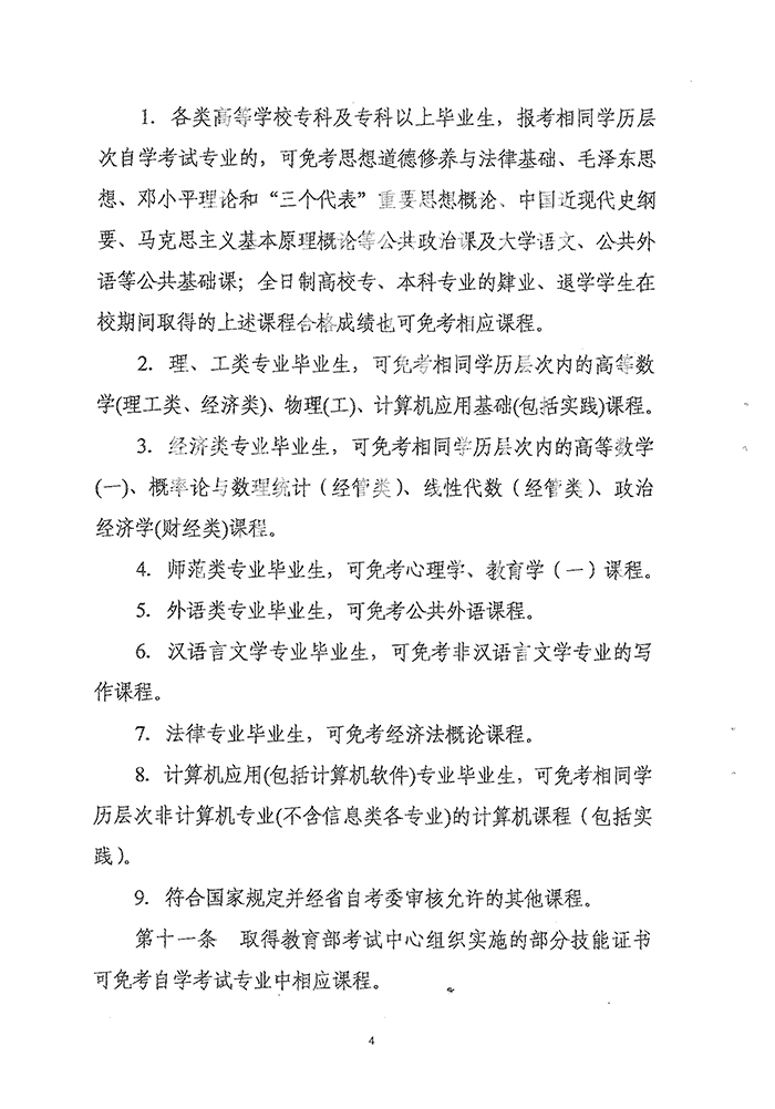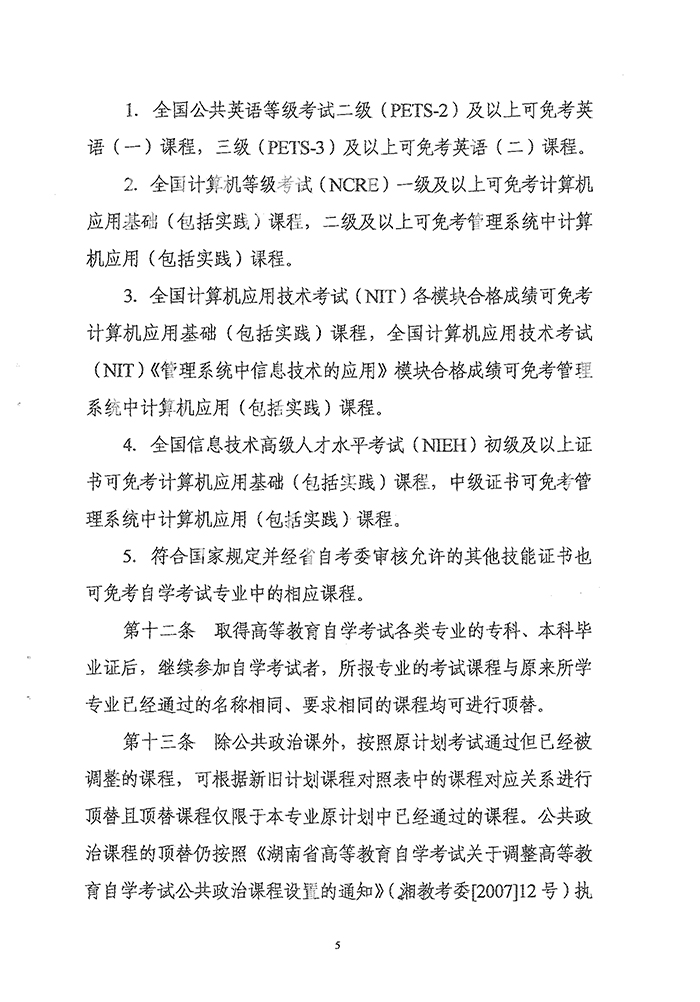湖南省高等教育自学考试课程免考规定