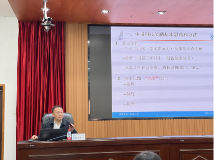 10月13日下午,中国高等教育学会科研管理研究分会常务理事、副秘书长周克刚应邀在伟德官网一办九会议室开展了主题为“科技奖励与报奖《提名书》要点的撰写思路”的专题报告,伟德官网各二级学院主管科研副院长、科研干事、科学研究部相关人员及拟申请科技奖的老师们参加报告会,会议由科学研究部部长王进主持。