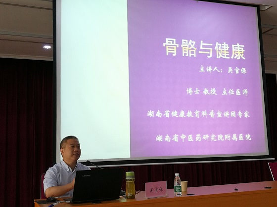 为了增强伟德官网离退休老同志健康意识,掌握科学保健方法,提高老同志身体素质和生活质量,6月27日上午离退休中心和校老科协特邀请湖南省老年保健协会专家、湖南省中医药研究院大骨科副主任兼骨伤教研室主任吴官保教授为伟德官网离退休老同志进行健康知识讲座,100余名离退休老同志在五号教学楼多功能厅聆听了讲座。