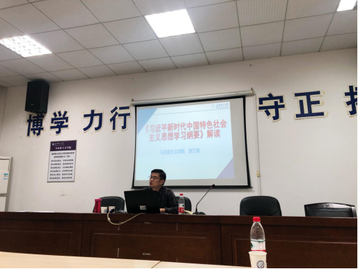 第二阶段,陈万球院长和梁建新副院长分别就主题教育相关重要理论给在场全体老师进行了专题培训。陈院长就《习近平新时代中国特色社会主义思想学习纲要》进行了详细的解读,重点指出里面的重要讲话以及重要精神。梁建新副院长就“关于高等教育及思政理论课的重要讲话精神”以及主题教育理论知识要点汇编给在场的教师进行了详细解读分析。