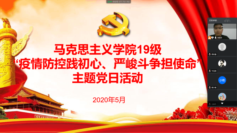 为落实学校党委关于在统筹推进疫情防控工作中的要求,进一步发挥基层党组织战斗堡垒作用和党员先锋模范作用,引导党员在战“疫”中守初心、担使命,伟德betvlctor体育官网马克思主义学院2019级研究生党支部结合实际情况,聚集“疫情防控践初心、严峻斗争担使命”的主题,于5月12日下午两点在线上成功召开主题党日活动,参加会议的包括支部所有党员以及勇敢地在此次疫情中奉献的6名积极分子,会议由党支部书记李袁远主持召开。