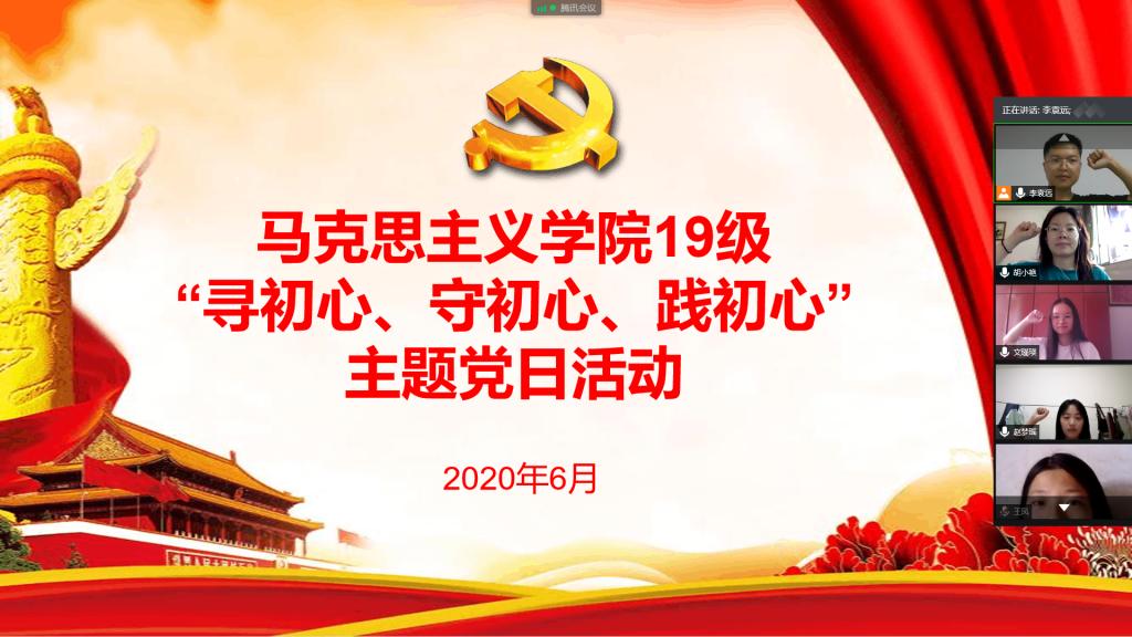 2020年06月29日下午2:00,马克思主义学院19级研究生全体党员在云端围绕“迎七一、庆七一”,以“寻初心、守初心、践初心”为主题成功召开主题党日活动。此次会议由支部书记李袁远主持,19级研究生党支部全体党员参加。