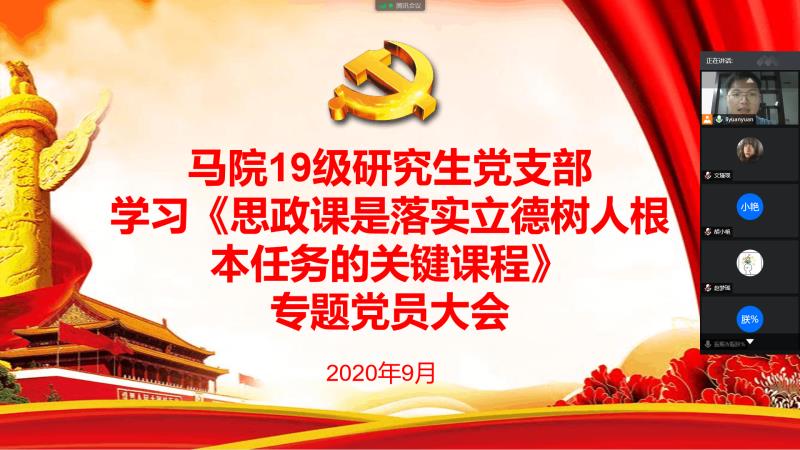 2020年9月10日晚7点30分,马克思主义学院2019级研究生党支部通过腾讯会议平台,召开了学习《思政课是落实立德树人根本任务的关键课程》、《习近平谈治国理政》第三卷及《习近平教育总书记重要论述讲义》专题党员大会。本次会议由支部书记李袁远主持。