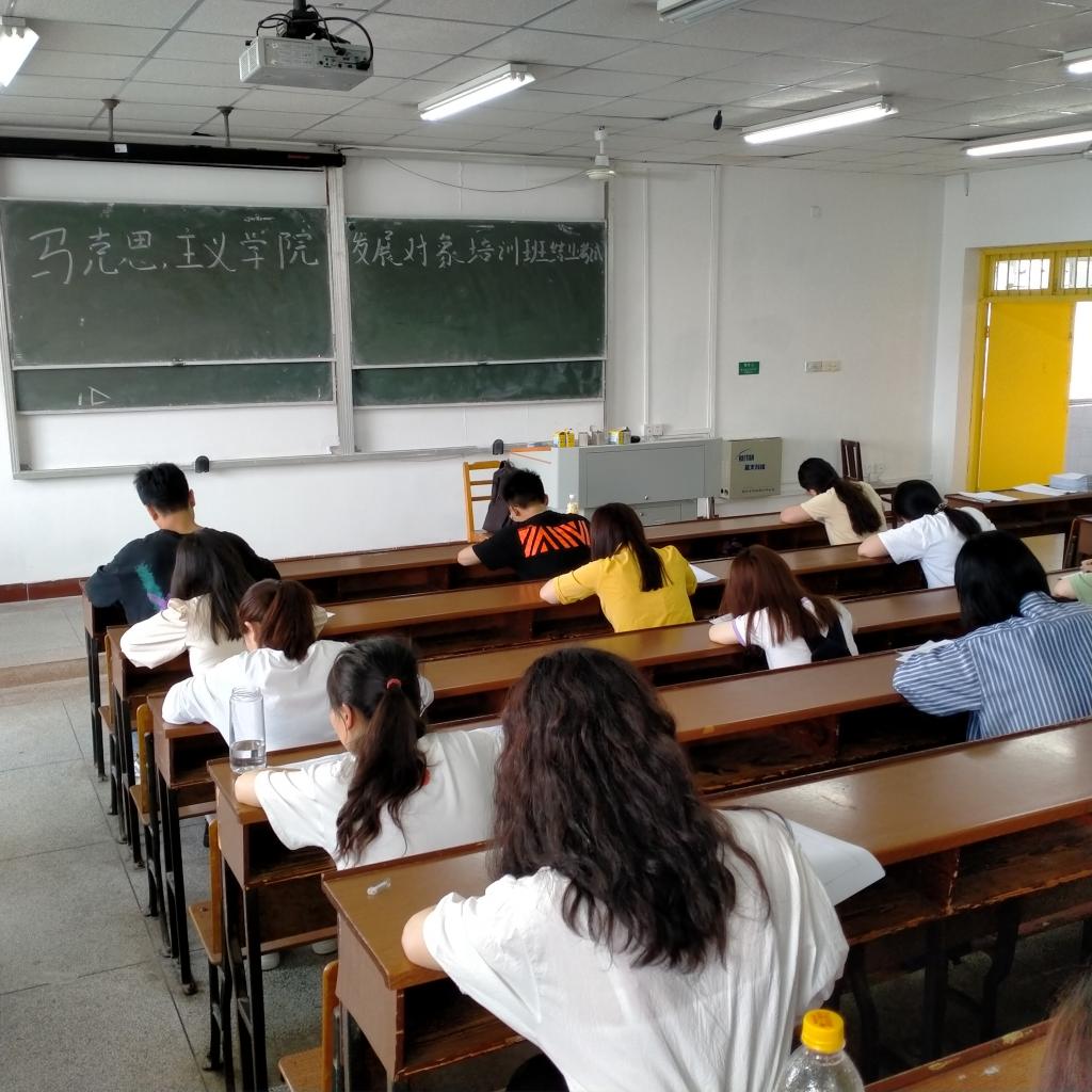 2021年5月9日,马克思主义学院2021上期发展对象培训班结业考试在金盆岭4教510教室举行,参与考试人员为2019级发展对象19人,2020级发展对象2人。监考人员为马克思主义学院2019级研究生党支部学生党员和预备党员。考试中,参考人员严格遵守考场纪律,根据平时所学党的知识和政治思想感悟认真答题,考场秩序井然。