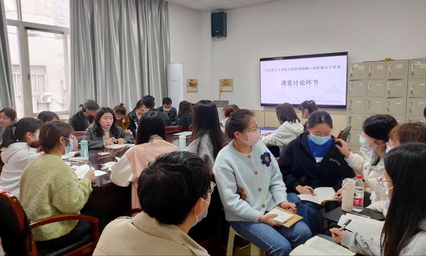 2022年4月17日上午,马克思主义学院2022年上期入党积极分子培训班于金盆岭4教503教室开展学习活动,马克思主义学院2022年上期全体入党积极分子共同参与。上午9:00入党积极分子培训班组织观看了关于习近平新时代中国特色社会主义思想的网络视频课程,由党员代表吴彩虹、郑进、杨珺负责监督。上午11:00开展了有关习近平新时代中国特色社会主义思想的集中交流讨论,党员代表龙韬沁、朱璐、刘佳熠参加辅导和学习讨论,并负责监督。