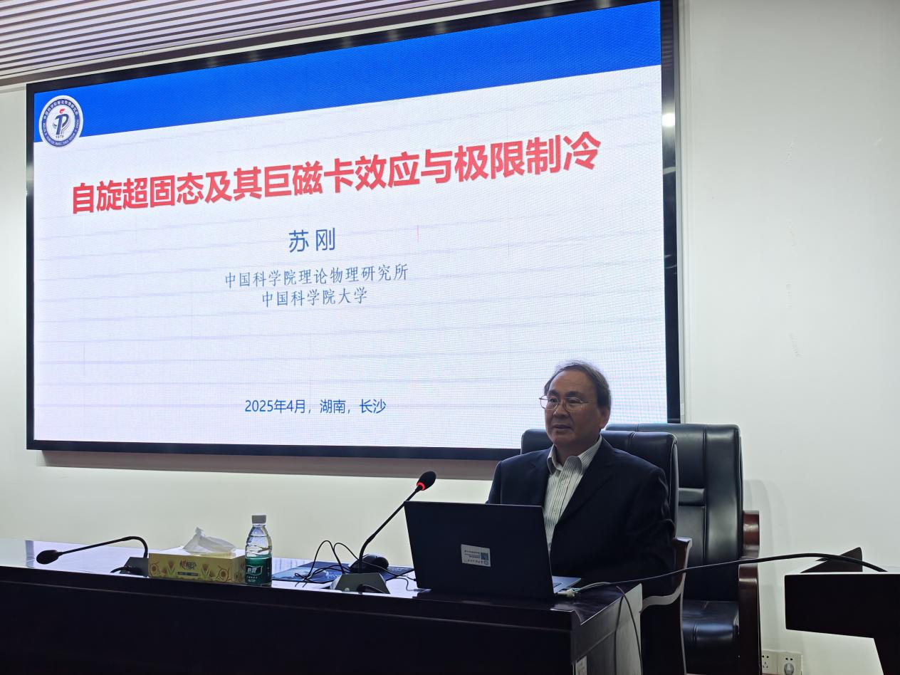 2025年4月26日下午,中国科学院理论物理研究所苏刚教授应邀来伟德官网交流指导,在理科楼B413会议室作了题为《自旋超固态及其巨磁卡效应与极限制冷》的学术报告。我院六七十余名师生积极参加了此次学术报告会,会议由邓科教授主持。