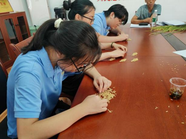 水稻测产工作主要分为两个环节,一是取样,每块田对角线3点取样。二是测算,量取11行稻谷,测算行距;量取11株,测算株距,计算每亩穴数,顺序选取20穴调查穗粒数、结实粒数,进而推算出该田地的水稻产量。科普创造营队员们分工协作,有的数每捆水稻株数,有的数每株水稻的总穗粒数、空粒数,并汇总给记录员,当天共完成了5户人家的水稻测产工作。