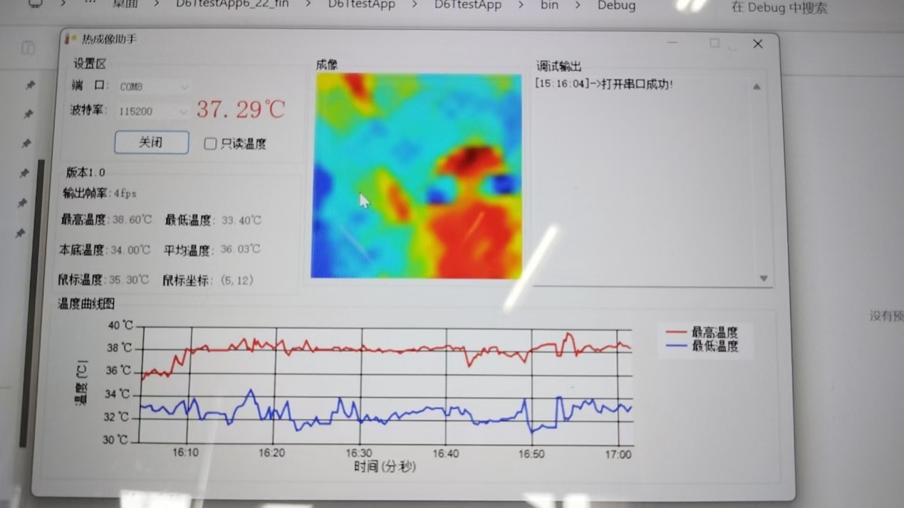 抵达公司后,实践团在工作人员的带领下对湖南奕元科技有限公司进行了参观,深入了解了相关科研实验室的环境要求、实验守则及安全注意事项等。接着,在公司科研骨干的协助下,将自主研发设计的步进电机运动控制模块、温度控制及显示模块与公司的二维半自动扫描平台组装在一起,进行红外热成像装置的组装、测试和调试,并在电脑上用之前写好的热成像助手软件显示红外热成像模块的成像结果。
