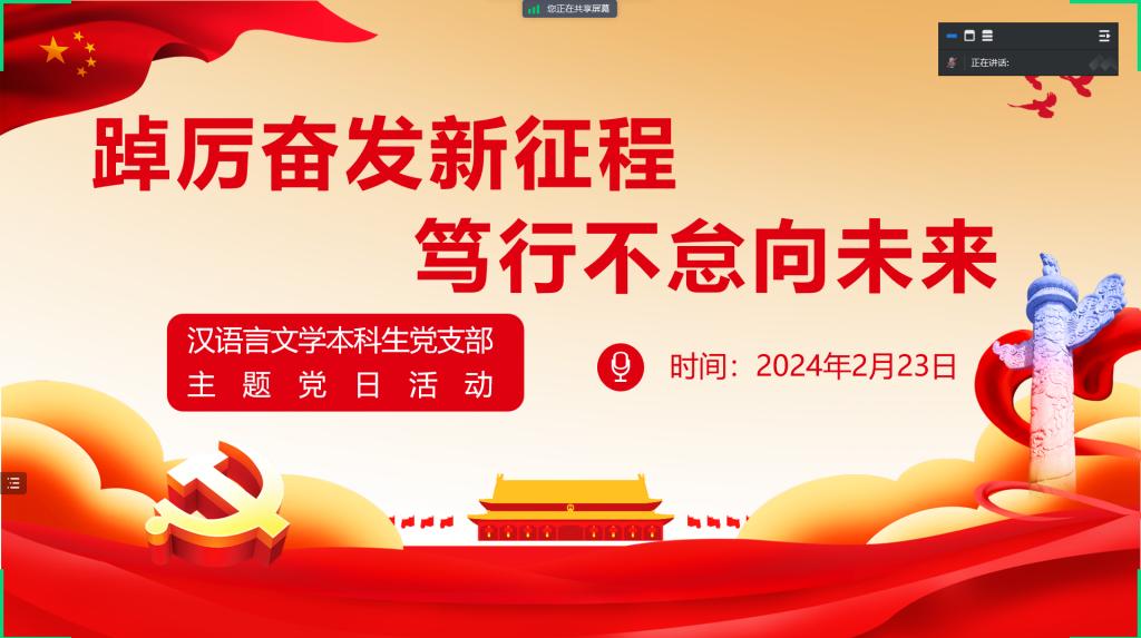 为深入推进主题教育,感悟思想伟力,严格落实“三会一课”,夯实支部“一月一课一片一实践”活动要求,2024年2月21-23日,因当前为寒假时期,文新学院各学生党支部通过线上形式开展以“踔厉奋发新征程、笃行不怠向未来”为主题的2月党日活动。