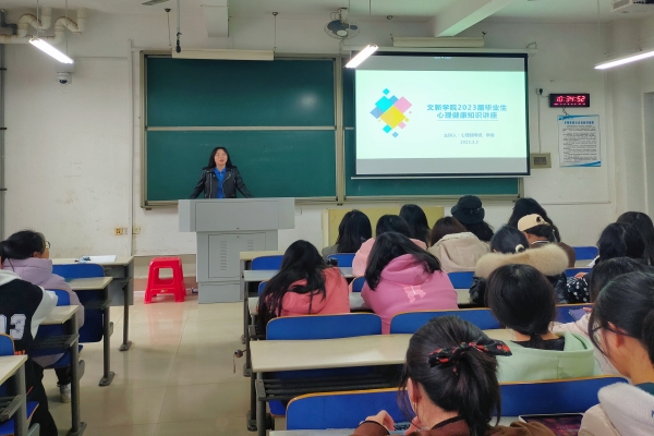 为进一步提高毕业生心理健康意识和情绪调适能力,33日上午1040分,文新学院在工一B220教室举行2023届毕业生心理健康知识讲座,学院心理辅导员李婵主讲,2023届全体本科毕业生参加。