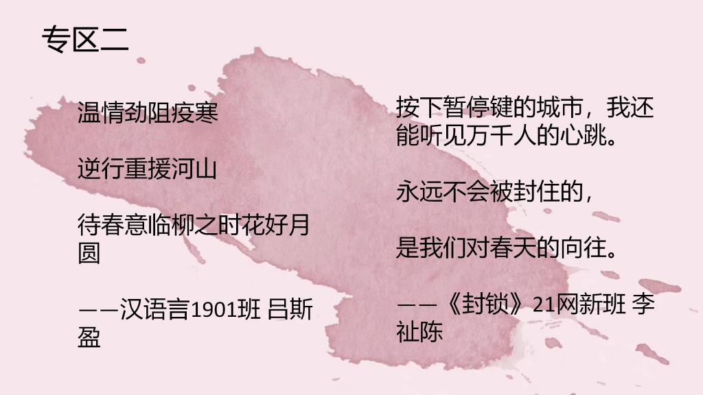 本次大赛面向文新学院全体学生,旨在以创作三行情诗的形式,让同学们表达爱的心声。大赛分有“诉真情”、“青年说”、“战疫情”三个专区,学生可自由选择专区投稿,表达对友情、亲情、爱国之情等的感悟与思考。比赛开始后,大家踊跃投稿,创作出75篇优秀的诗歌作品,经评委初选通过的作品在文语新苑公众号大众投票,最终在三个专区中各选出一等奖一名,二等奖两名,三等奖三名。