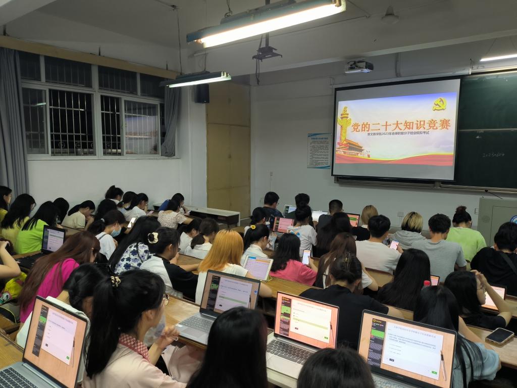 为深入学习与深刻贯彻落实党的二十大精神,积极探索“互联网+党建”新模式,进一步提升入党积极分子的理论知识能力水平,2023年6月4日晚7点30分,“党的二十大知识竞赛暨文新学院2023年春季积极分子结业模拟考试”于伟德官网金盆岭校区三号教学楼成功举行。