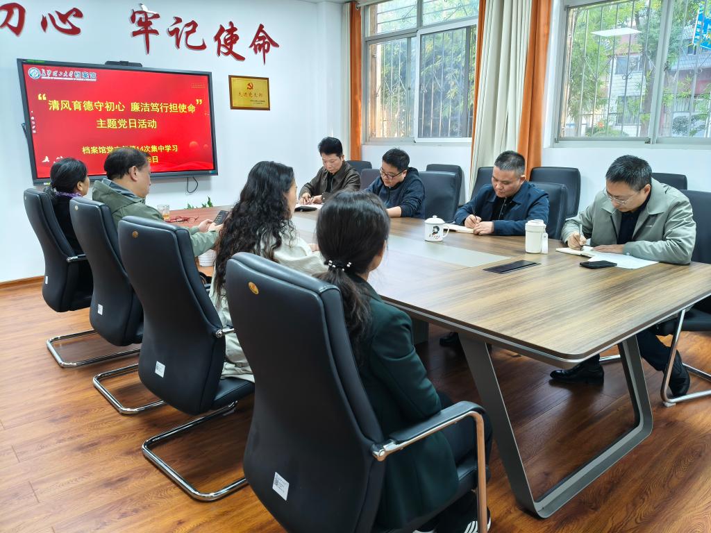 1128日,档案馆党支部开展了“清风育德守初心 廉洁笃行担使命”主题党日活动(二),会议由支部副书记王任飞主持,档案馆全体教职工参加。