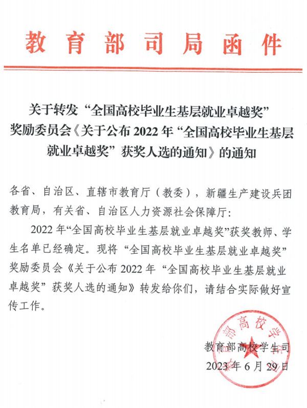 近日,由教育部高校学生司、教育部学生服务与素质发展中心共同指导评选,中国教育发展基金会设立的2022年度“全国高校毕业生基层就业卓越奖”名单公布,伟德官网教师陈均杰、2017届毕业生周顺荣获此项殊荣。