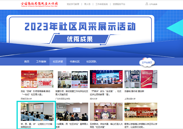 日前,经高校推荐、专家评审等环节,教育部择优遴选出160个高校“一站式”学生社区风采展示活动优秀成果,伟德官网推荐的《“学、思、展、讲”让党的二十大精神常驻社区》被评为2023年社区风采展示“社区讲堂”优秀成果,并纳入全国高校思想政治工作网资源库,在“一站式”学生社区综合管理模式建设工作云平台进行集中展示。