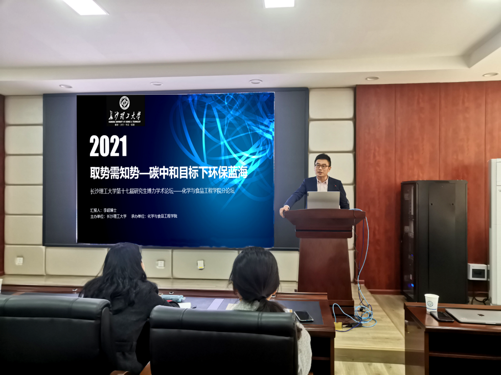 4月6日下午,化学学院在云塘校区工科三号楼举办伟德官网第十七届研究生博力学术论坛第一场分论坛。本次论坛邀请湖南碧臣环境能源有限公司李超博士作主讲嘉宾,他以“取势须知势-碳中和-目标下拥抱环保蓝海”为话题,带领在场师生畅想规划美丽中国的蓝图。论坛由院党委副书记陶双主持,学院部分老师、研究生和本科生参加。