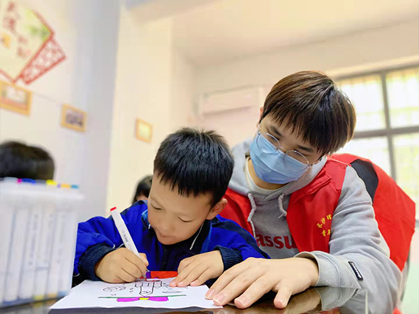 志愿者用有趣的手工作品吸引小朋友们的注意力,在黑板上完成示范后邀请小朋友们一同拿起纸笔,以“礼物”为题进行创作。在志愿者悉心的指导下,一个个奇思妙想的“礼物”在孩子们手中诞生。“送给妈妈的小熊”“送给好朋友的小汽车”……小朋友们积极地向志愿者们介绍这份独一无二的“礼物”。小朋友手拿自己的作品,洋溢着快乐与自豪的笑容。