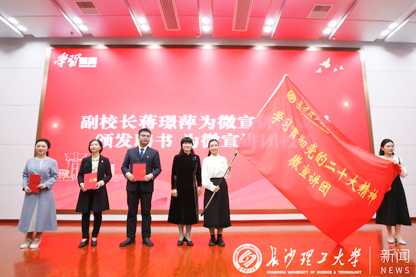 蒋璟萍为伟德betvlctor体育官网学习贯彻党的二十大精神微宣讲团成员代表颁发聘书,并为微宣讲团授旗。